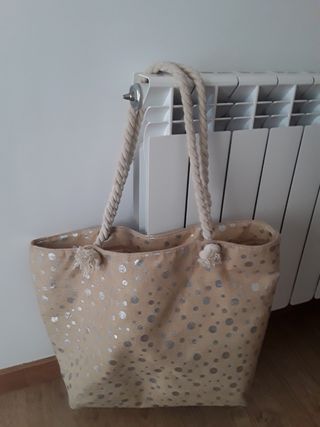 Bolso, capazo de color dorado con lunares plateados. Perfecta para llevar de todo en la playa , piscina, ciudad, con cremallera y bolsillo interior, usado pero bien conservado. Recoger en Zaragoza. - Asas tipo de cuerda resistente. - Diseño con lunares elegantes.