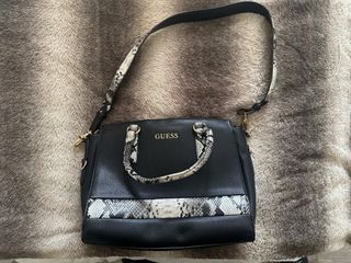 Elegante bolso de la marca Guess con un diseño moderno. UN SOLO USO - Color negro principal. - Detalle de estampado de serpiente en asas y banda frontal. - Asa larga ajustable y asas cortas para llevar en mano.