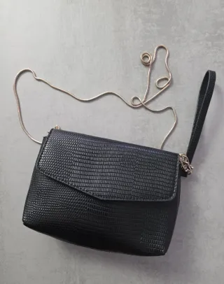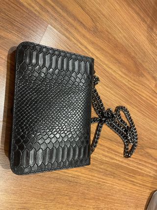 Bolso con solapa con efecto de piel de serpiente de color negro. Cuenta con dos asas, una mas larga y otra mas corta. Tiene cierre de cremallera, dos broches magneticos internos y tres bolsillos. Precio negocible. Cualquier duda escridibme al chat sin problema.