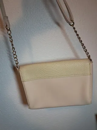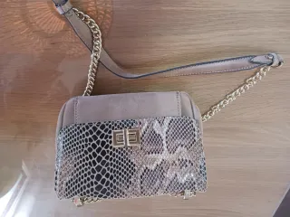 Elegante bolso de mano con un diseño moderno y sofisticado. - Acabado texturizado tipo piel de serpiente en la solapa. - Combinación de texturas y tonos neutros. - Detalle metálico frontal. - Correa de cadena dorada para llevar al hombro o cruzado. No tiene marca