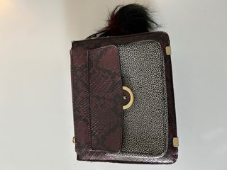 Pequeña cartera con un llamativo estampado de serpiente y detalles en guinda y negro, material cuero. Cuenta con un asa larga desmontable para mayor comodidad. - Estampado de serpiente. - Asa larga desmontable. - Logo de la marca visible. -Sistema de apertura con cierre y tiracierre de cuero -Altura 19cm -Ancho 11cm