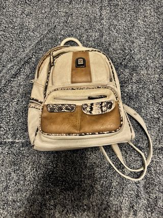 Mochila bolso con un diseño moderno y práctico. - Combinación de colores beige y marrón. - Detalles en estampado de serpiente. - Bolsillo frontal con cremallera. - Compartimentos interiores.