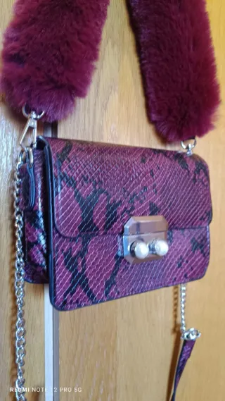 Elegante bolso con un llamativo diseño efecto piel de serpiente. - Acabado en piel sintética. - Cierre metálico con detalle de perlas. - Cadena plateada para llevar al hombro o cruzado. - Adorno de pelo sintético en la correa.