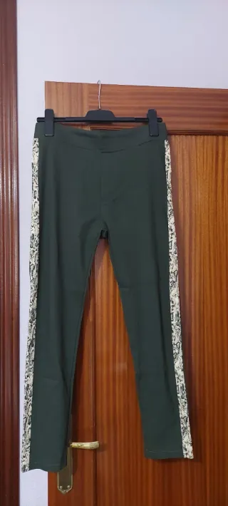 Leggings verde botella con detalle de serpiente en los laterales. Simula abertura frontal y tiene bolsos traseros. Tela fuerte de algodón muy elástica. Mide 40 cm de cintura que estira hasta 48 y 93 de largo. Talla real 42. Poco uso.