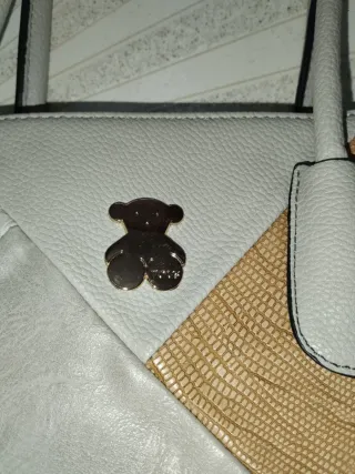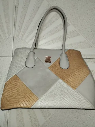 Bolso Tous con un diseño patchwork único que combina texturas y colores. - Paneles en gris claro y detalles en dorado. - Acabado con efecto piel de serpiente y liso. - Logo metálico de oso Tous en la parte frontal.( No sé si es original ).