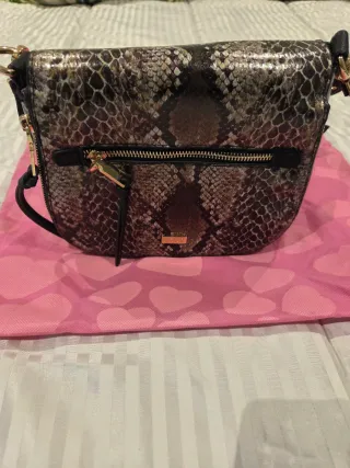 Elegante bolso de mano con diseño de piel de serpiente y detalles en negro. - Combinación de texturas. - Logo de la marca en dorado. Me han dicho en la tienda que no lo venda, que es una joya, pero lo compré hace más de 20años y nunca lo he usado y no creo que lo use ya. Lo tengo guardado en su bolsa de tela original y en caja, por lo que está perfecto. A mí me costó más de 130€ en su día. Ahora no se lo que podría valer.