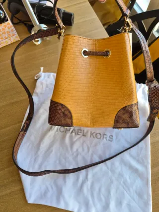 Bolso de mano Michael Kors con un diseño moderno y elegante. - Combinación de colores amarillo y marrón. - Detalle de estampado de serpiente en las asas y ribetes. - Cierre de cordón ajustable.