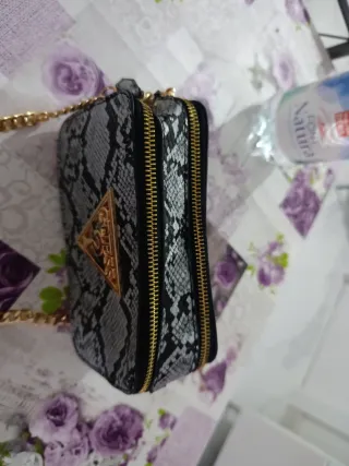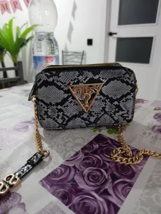 Elegante bolso Guess con un llamativo estampado de serpiente en tonos beige y dorado. Perfecto para añadir un toque de estilo a cualquier atuendo. - Diseño con estampado de serpiente. - Detalles metálicos dorados. - Cierre de cremallera.