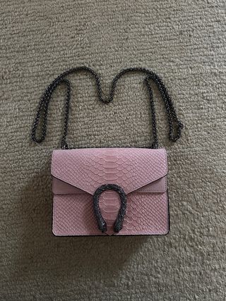 Elegante bolso de mano con un diseño inspirado en la piel de serpiente. - Material exterior: piel con textura de serpiente. - Color: rosa. - Cadena metálica para llevar al hombro o cruzado.