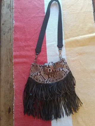 Bolso bandolera de Zara con un diseño llamativo. - Acabado efecto piel de serpiente. - Adornado con flecos largos. - Correa ajustable para llevar cruzado o al hombro.