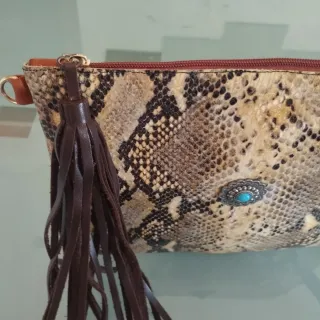 Elegante bolso de piel con un llamativo estampado de serpiente. Un accesorio único que añade un toque de estilo. - Diseño con flecos de cuero. - Detalle central con piedra turquesa. - Incluye correa de mano y correa de hombro regulable