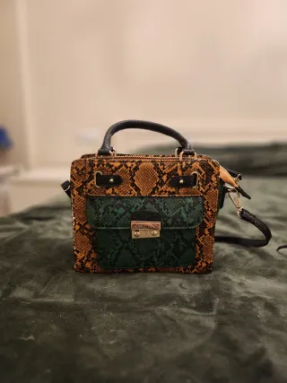 Bolso con un diseño llamativo y moderno. - Estampado de serpiente en tonos naranja y marrón. - Panel frontal en color verde. - Cierre metálico dorado.Con la compra de este bolso te regalo otro que esta en la ultimo foto.