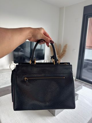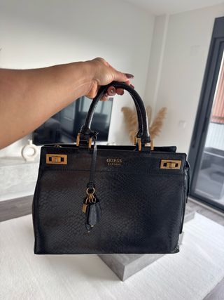 Elegante bolso de la marca Guess con un diseño moderno. UN SOLO USO - Color negro principal. - Detalle de estampado de serpiente en asas y banda frontal. - Asa larga ajustable y asas cortas para llevar en mano.