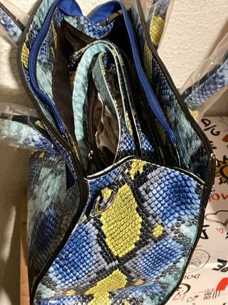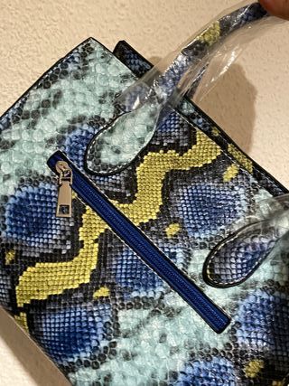 Bolso con un llamativo estampado de serpiente en tonos azules y amarillos. Ideal para añadir un toque de estilo. - Diseño de serpiente. - Cierre de cremallera.