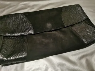 Bolso con solapa con efecto de piel de serpiente de color negro. Cuenta con dos asas, una mas larga y otra mas corta. Tiene cierre de cremallera, dos broches magneticos internos y tres bolsillos. Precio negocible. Cualquier duda escridibme al chat sin problema.