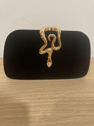 Elegante bolso de mano tipo pochette con un diseño llamativo. - Adorno de serpiente dorada con incrustaciones. - Acabado en terciopelo negro.