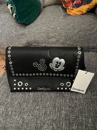 Bolso Desigual con diseño de Mickey Mouse. Totalmente nuevo a estrenar. Sin usar. Mas de una unidad disponible. - Color negro con detalles en rojo. - Adornos metálicos. - Llavero de Mickey Mouse. - Logo de Desigual.