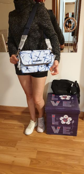 bolsos medianos por capacidad, azulito, con la etiqueta, ideal regalo, 23€, franjas azul marino mediano/grande, 5 cremalleras, 7 departamentos separados. Mucha capacidad, pero muy recogidito. Bolso negro, 23.90€, con 3 cremalleras, mediano, bastante capacidad, estampado. Monedero Desigual, (4 €) ambos casos correas ajustables, y cómodas, (tengo otras correas de bolsos desigual, versátiles y la calidad de Desigual, siempre excelente.