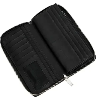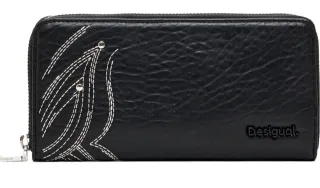 Elegante monedero Desigual en color negro, con un diseño distintivo. Está totalmente nuevo. De 50€ lo dejo por 35€. - Detalle de bordado blanco en forma de mariposa. - Cierre de cremallera completo. - Logo de la marca grabado en relieve.