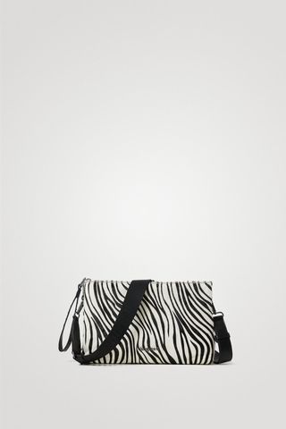 Bolso de piel con estampado animal de cebra, por un lado, y de manchas por el otro, con dos compartimentos y cierre de cremallera.