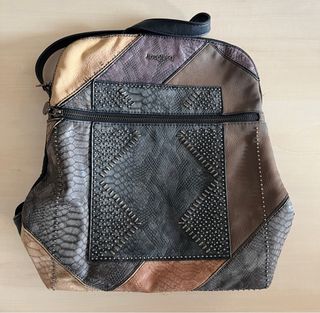 Bolso Desigual original, usado solo dos veces. Presenta un diseño patchwork con diferentes texturas y colores. - Asa trenzada. - Correa larga ajustable. - Cierre de solapa.
