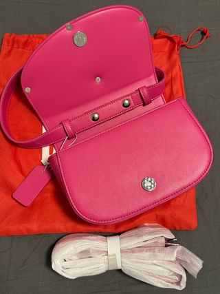 Bolso de hombro Diesel con un diseño moderno y práctico, similar a la medialuna. - Color rosa y detalles en marrón. - Dos bolsillos frontales con solapa. - Correa ajustable. - Cierre de cremallera. Precio negociable