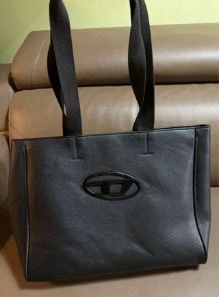 Bolso de mano de la marca Diesel en color negro. Presenta un diseño elegante y moderno. - Logo metálico en relieve en la parte frontal. - Asas de tela resistentes.