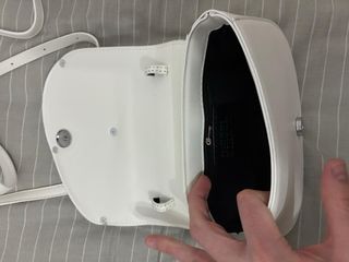 Bolso de la marca Diesel en color blanco. Presenta un diseño ovalado con el logo de la marca, tiene marcas de boli que lastimosamente no he podido quitar, poner el precio. - Logo de Diesel en relieve. - Cierre de solapa.