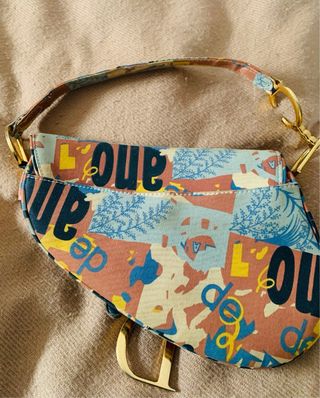 Bolso estilo Saddle de la marca Dior con un diseño llamativo. - Estampado multicolor con detalles en dorado. - Asa ajustable. - Cierre de solapa.
