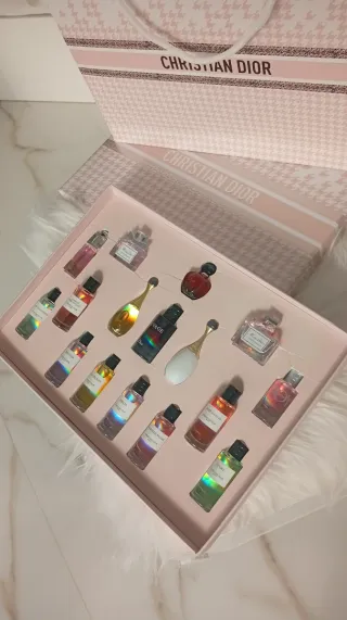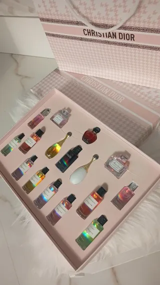 Set de 16 miniaturas de perfumes de la marca Dior. - Incluye una variedad de fragancias. - Presentado en una caja de regalo con su bolsa. - Ideal para coleccionar o probar diferentes aromas.