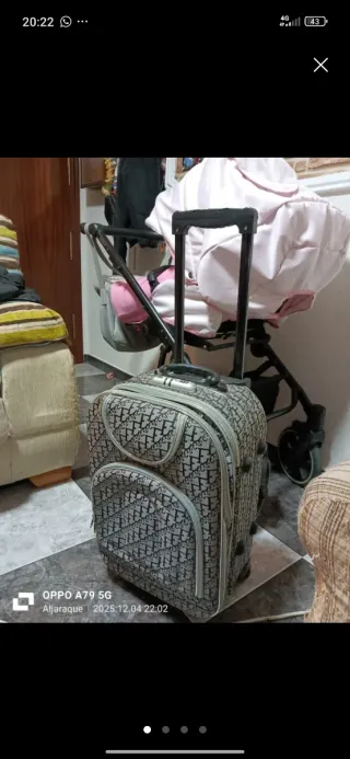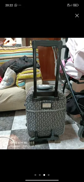 Maleta de viaje con un diseño elegante y distintivo. - Patrón de la marca en toda la superficie. - Color beige versátil. - Asa extensible para facilitar el transporte.