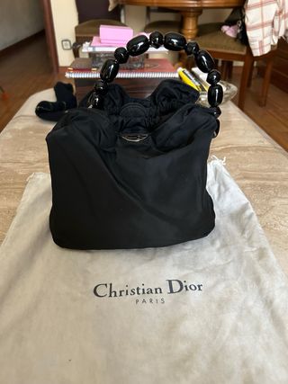Bolso Christian Dior con un diseño elegante y llamativo. - Asas superiores adornadas con cuentas negras - Material nylon Dior - Cierre fruncido superior. - Incluye bolsa guardapolvo con logo de Christian Dior Paris