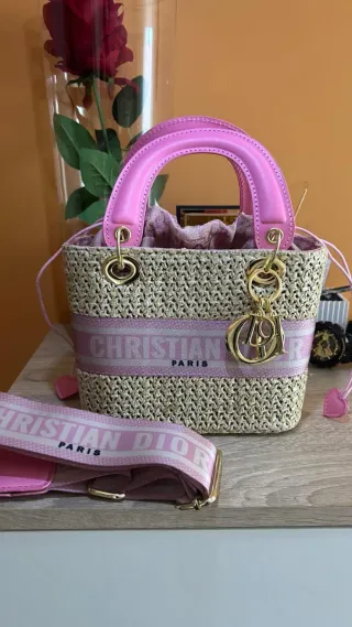 Bolso de mano y bandolera con detalles en rosa y tejido de rafia. - Correa de bandolera con logo Christian Dior Paris. - Charm Dior dorado. - Cierre de cordón.
