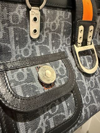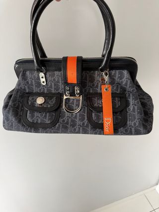 Elegante bolso Dior con un diseño distintivo. - Estampado icónico de la marca. - Detalles en color naranja vibrante. - Acabados en piel negra.