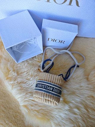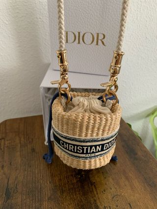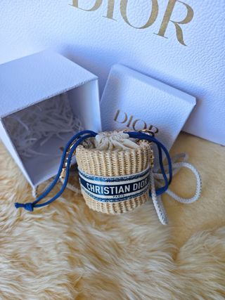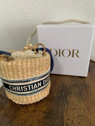 Pequeño neceser de la marca Dior. - Tejido de rafia. - Cinta con logo Christian Dior Paris en contraste azul y blanco. - Cuerda para colgar.