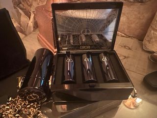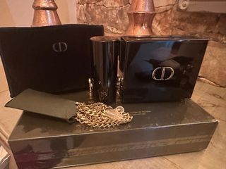 Elegante cofre de labiales de la marca Dior. Un set de lujo para coleccionistas. - Incluye neceser negro. - Estuche negro brillante con logo CD. - Cadena dorada. - Bolsa de terciopelo negra. - 4 labiales