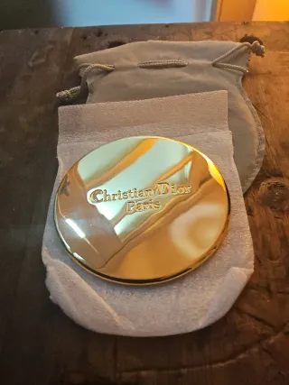 - Elegante espejo de bolso de Christian Dior Paris. - Acabado dorado brillante. - Incluye funda protectora de tela.