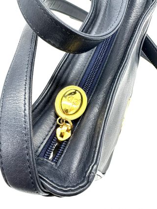 Bolso Dior vintage original en piel azul marino. Modelo bandolera con logo CD dorado en el frontal y cierre de cremallera con tirador también dorado. Un bolso de lujo de segunda mano en excelente estado, sin marcas visibles y con un diseño clásico ideal para uso diario o para coleccionistas de bolsos Dior vintage. Compacto y elegante, mide 17x16x8 cm. Perfecto para llevar lo esencial con estilo y distinción. Autenticidad garantizada. No se aceptan cambios. Barcelona 0571