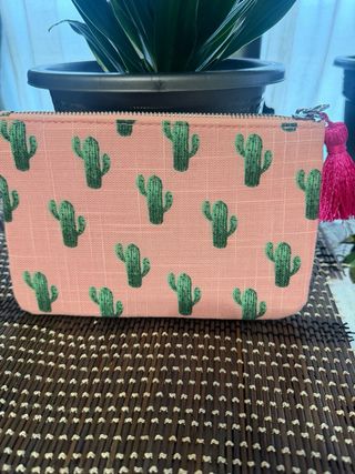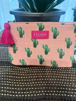 Neceser con un divertido estampado de cactus sobre fondo rosa. Cuenta con un detalle de pompón fucsia. - Cierre de cremallera. - Etiqueta de la marca Escada. Nuevo a estrenar