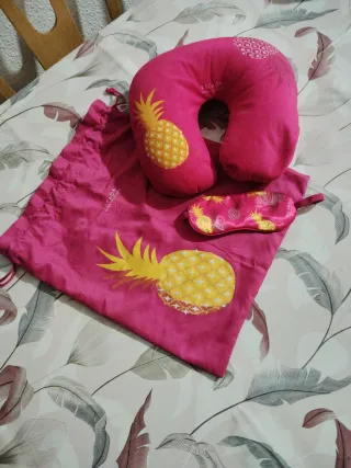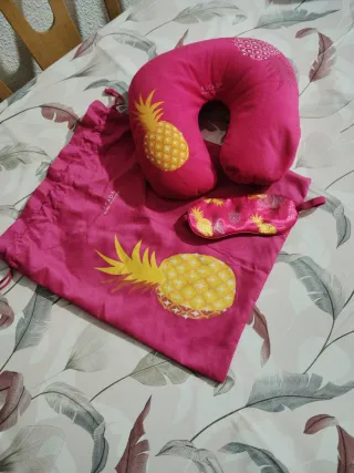 Set de descanso de la marca Escada con un divertido estampado de piñas. - Incluye cojín de viaje. - Incluye antifaz. - Incluye bolsa. - Color rosa y amarillo. Tiene algún roce de estar guardado,