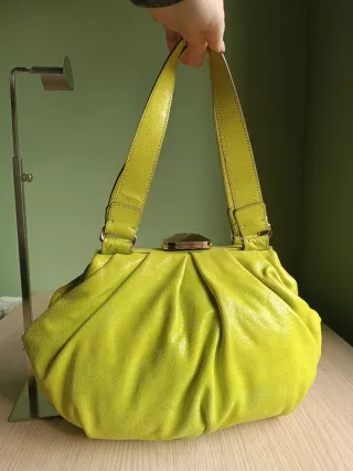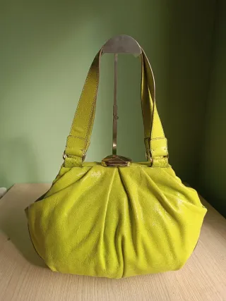 Bolso Escada de piel con un diseño llamativo en tono verde pistacho o neon. - Medidas: 20 cm alto, 35 cm de fondo, 15 cm de fondo, (23 cm alto de las asas). - Puede tener algun signo de uso pero poco visible. - Cierre de clip con marco metalico.