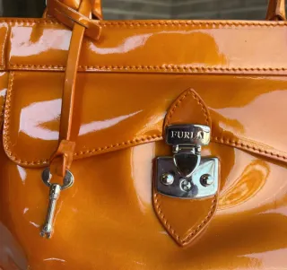 Bolso de mano Furla en llamativo color naranja y acabado charol. - Diseño elegante y moderno. - Cierre metálico con detalle de llave. - Asa superior para llevar en la mano o en el antebrazo.