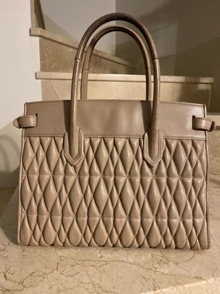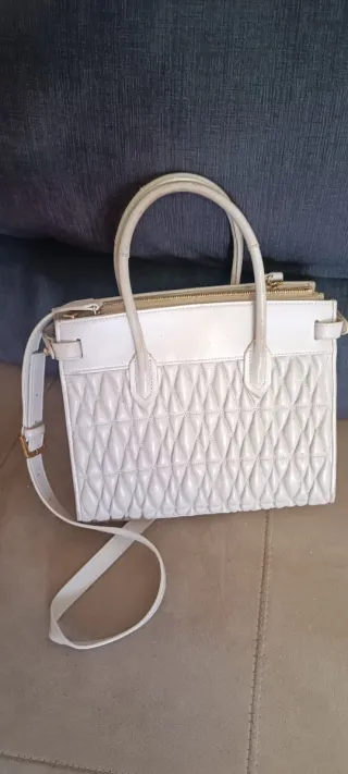 Elegante bolso Furla de color beige con un diseño acolchado en rombos. Cuenta con asas superiores y una correa larga ajustable para llevarlo cruzado o al hombro. - Diseño acolchado. - Cierre de cremallera. - Correa desmontable y ajustable. Como podeis ver en las imágenes está manchado de color lila en un costado!
