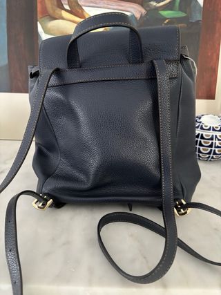 Mochila pequeña de cuero en color rojo, en excelente estado. - Diseño compacto y elegante. - Cierre de cremallera. - Asa superior y correas ajustables.