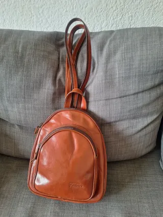 Mochila de piel con un diseño elegante y práctico. - Material: Piel. - Color: Marrón y naranja.