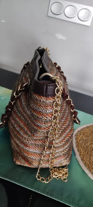 Elegante bolso de piel con detalles de cadena. - Material: Piel texturizada. - Color: Marrón. - Adorno: Cadena metálica dorada. - Cierre: Magnético. - Asas: Dobles asas de piel. - Interior: Compartimento principal amplio.