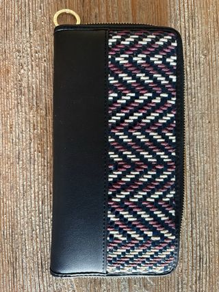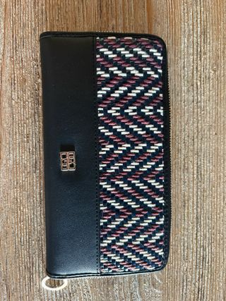 Elegante cartera de la marca Gloria Ortiz. - Diseño bicolor con panel frontal tejido. - Cierre de cremallera completo. - Detalle metálico frontal.