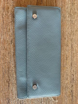 Elegante cartera de piel en tono azul. - Diseño texturizado. - Cierre con botón a presión. - Detalle metálico con logo.