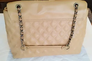 Elegante bolso de la marca Gloria Ortiz. - Color beige con detalles dorados. - Asas de cadena metálica. - Cierre de giro. - Diseño tipo solapa. - Medidas 33 largo x 15 ancho x 23 centímetros alto Usado, tiene dos pequeños desperfectos que casi ni se aprecian, dos últimas fotos.