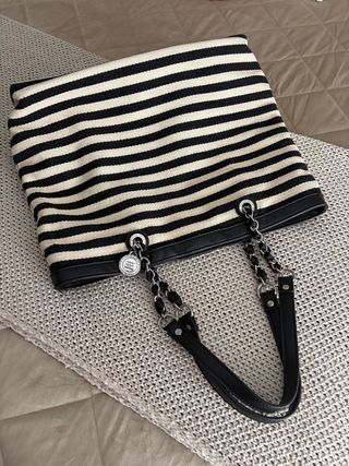 Bolso de mano con diseño de rayas blancas y negras. - Asa de cadena y piel. - Detalle de charm metálico.